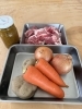 鍋または深めのフライパンに油を入れ、肉、人参、玉ねぎを炒める